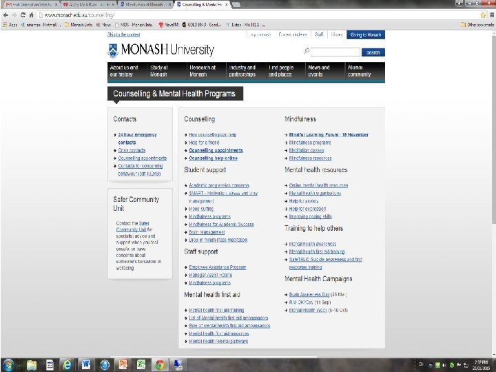 Safer Community Unit Non emergency advice regarding concerning, threatening, inappropriate behaviour Ask for help early if you: • feel threatened or unsafe • have concerns about someone else’s behaviour or wellbeing • don’t know what to do about unwanted attention, harassment, stalking • are worried about someone harming themselves or someone else Contact: 9905 1599 or safercommunity@monash. edu