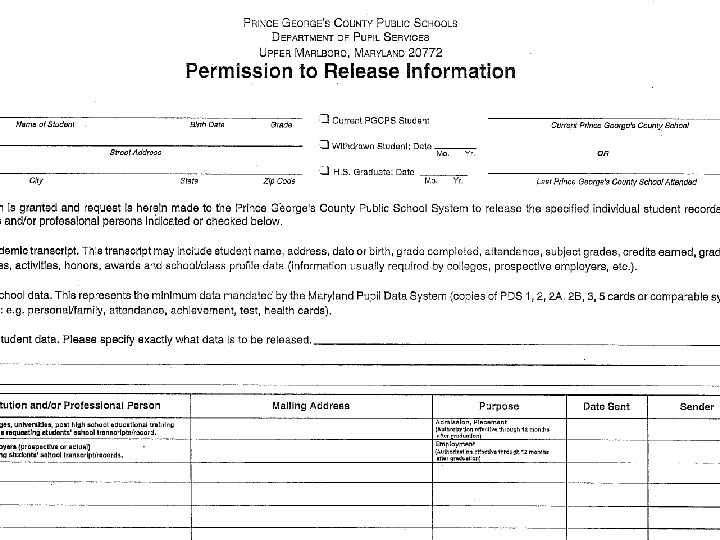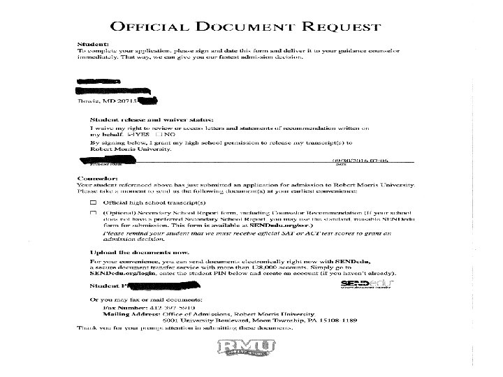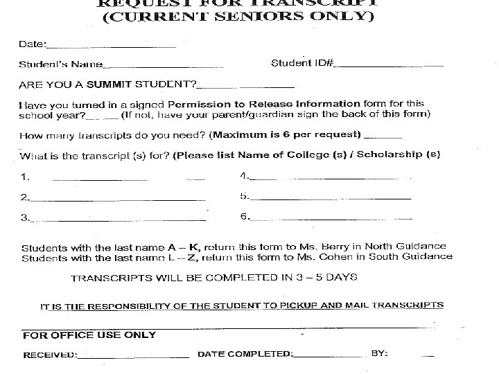 Transcript Request • Students should: • Submit the permission to release information form, which can be found in both North and South Counseling Offices, with the appropriate signatures (needs to be submitted one time only). • Submit a transcript request form (one must be filled out every time a transcript is requested). • Give the School Counseling Secretary three –five business days to generate transcript. • Return to pick up transcript (Counseling Office will not mail or fax transcripts).