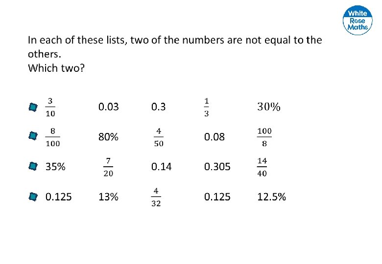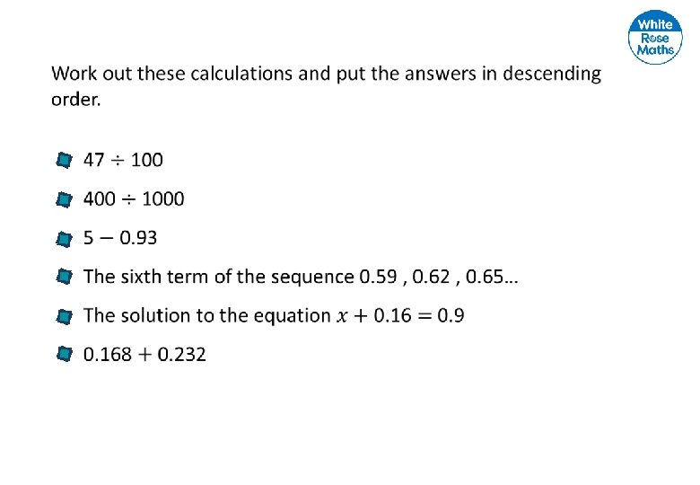 Write these numbers in decimal form and then put them in order, starting with the smallest. Zero point three five Fifty hundredths Seventy-two hundredths One tenth Nought point nought seven Nought point nought three Two hundredths