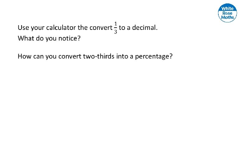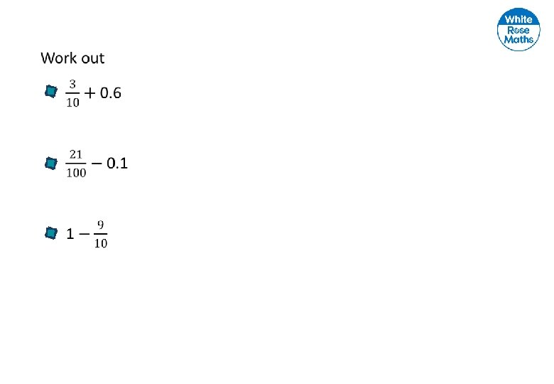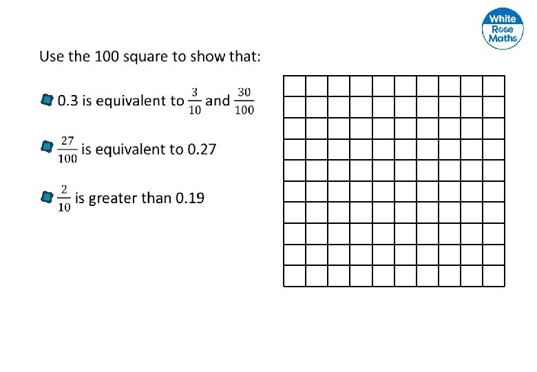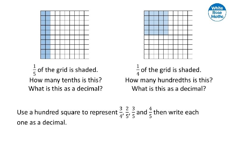 Express the amount shaded as: • a fraction • a decimal • a percentage Repeat for the amount not shaded.