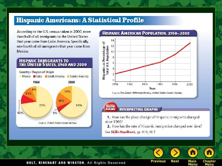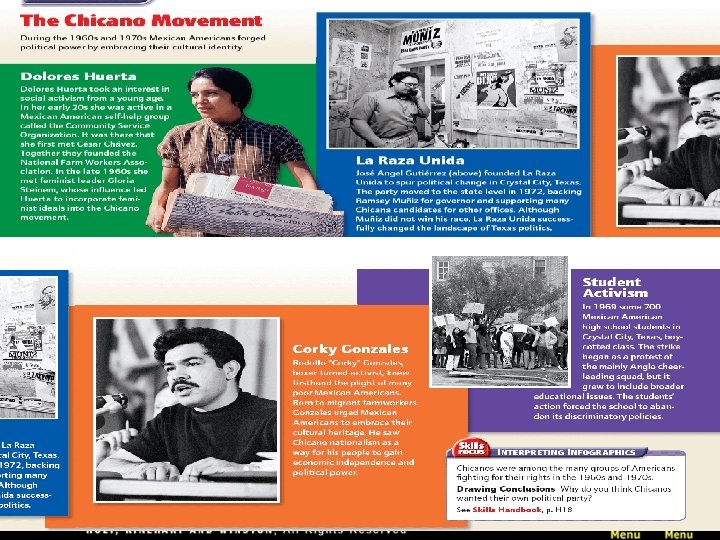 Latinos in the Early 1960 s • More than 900, 000 Latinos lived in the United States in 1960. A Latino is any person of Latin American descent. • One-third of Mexican American families lived below the poverty line and twice as many Mexican Americans as white Americans were unemployed. • Latinos faced discrimination in education. – Schools had less qualified teachers, fewer resources, and shabbier facilities. – Few teachers were able to speak Spanish. • In politics Latinos had far less power than the size of their population warranted. – Electoral district boundaries kept Latino votes scattered. – The number of Latinos in political office was very small. – Latinos were often excluded from serving on juries.
