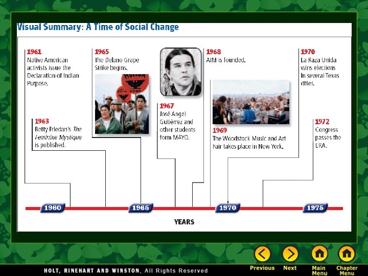 Latinos’ Struggle for Social Justice Delano Grape Strike César Chávez • Latinos sought social justice—the fair distribution of advantages and disadvantages in society. • Migrant agricultural workers, many of whom were Latino, received low wages for backbreaking labor. • In 1965 Filipino farmworkers went on strike in Delano, California. The National Farm Workers Association soon joined them. • He co-founded the National Farm Workers Association—a union of Mexican American farmworkers. • His leadership inspired many Mexican Americans to fight discrimination in their lives.
