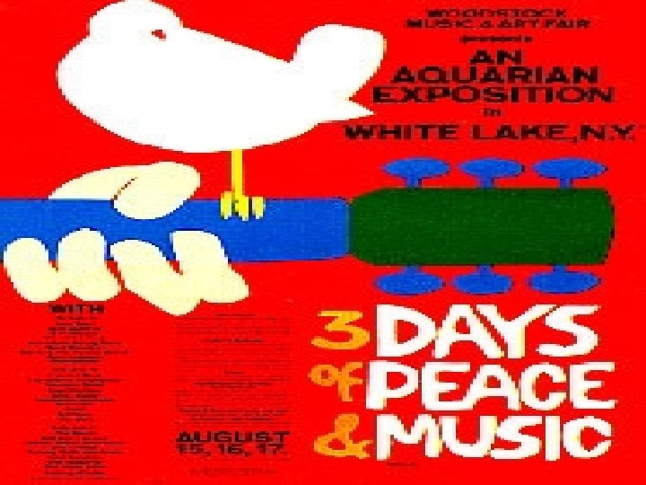 The Age of Aquarius • Or Hippie Era was marked by Rock ‘N’ Roll music, outrageous clothing, sexuality, and illegal drugs. When the Moon is in the Seventh House, and Jupiter aligns with Mars Then peace shall guide the planets, and love will steer the stars This is the dawning of the Age of Aquarius. . from: Aquarius / Let The Sunshine In; by Rado/Ragni/Mac. Dermot; EMI Music.