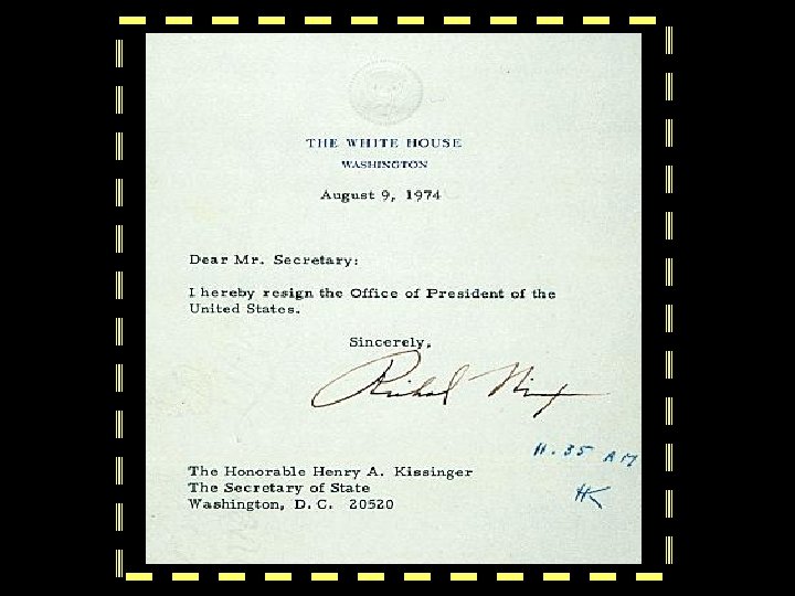 RESIGNATION v A delegation of the most senior members of Congress, led by Barry Goldwater, informed the President that no more than 15 Senators still supported him v On August 9, 1974, Nixon resigned v Vice President Gerald Ford became President and a month later pardoned Nixon