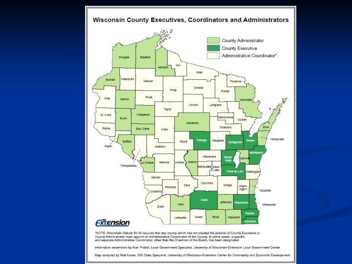 County Government n Wisconsin counties are governed by elected county board of supervisors n Some have nearly 40 members representing different areas and municipalities (i. e. supervisory districts) within the county
