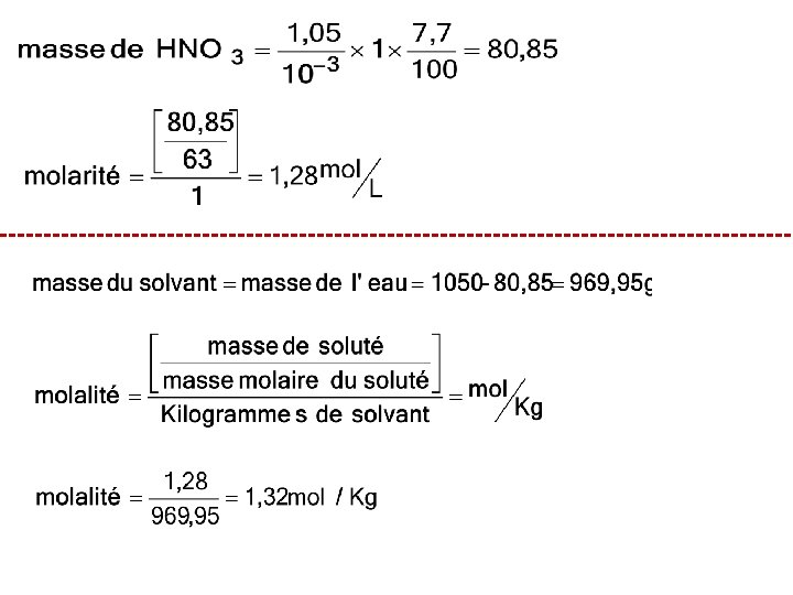 Exercices à faire § On prépare une solution aqueuse de concentration à 7, 7 % en HNO 3, la masse volumique de cette solution étant de 1, 05 g/cm 3, quelles sont la concentration molaire volumique (molarité) et la molalité de cette 1, 28 mol/l et 1, 32 mol/kg solution ? §On prépare une solution aqueuse de concentration à 31, 7 % en Na. OH, la masse volumique de cette solution étant de 1, 35 g/cm 3, quelles sont la concentration molaire volumique (molarité) et la molalité de cette solution ? 10, 72 mol/l et 11, 60 mol/kg