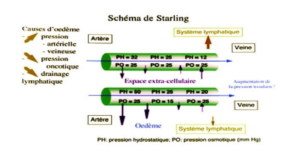 Formation des oedemes Altération de l'hémodynamique capillaire • Quatre mécanismes sont impliqués 1 augmentation de la pression hydrostatique capillaire 2 baisse de la pression oncotique 3 augmentation de la perméabilité capillaire 4 augmentation de la pression oncotique interstitielle Obstruction lymphatique