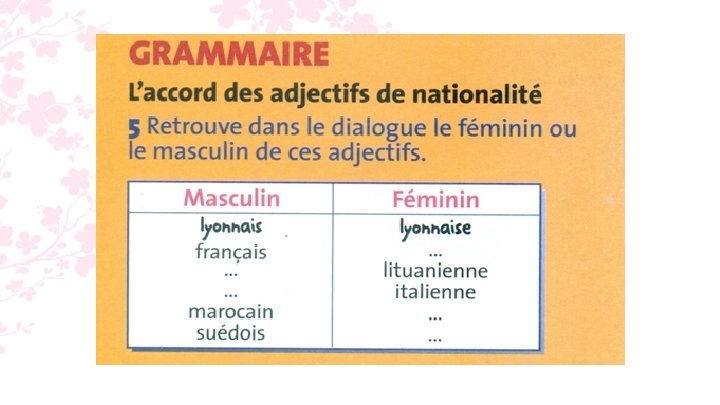 5. lyonais / lyonaise français / française lituanien / lituanienne italien / italienne marocain / marocaine suédois / suédoise
