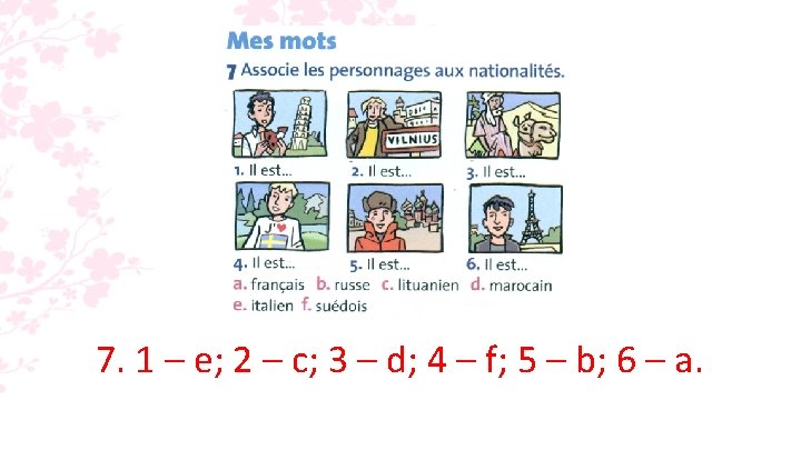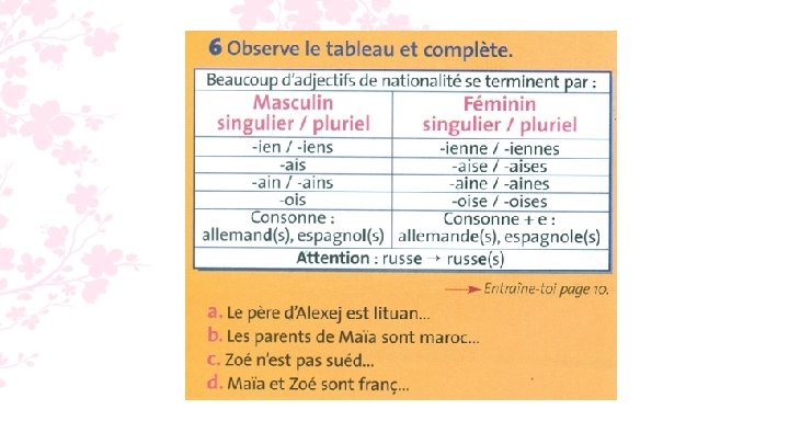 6. a. Le père d’Alexej est lituanien. b. Les parents de Maïa sont marocains. c. Zoé n’est pas suédoise. d. Maïa et Zoé sont françaises.