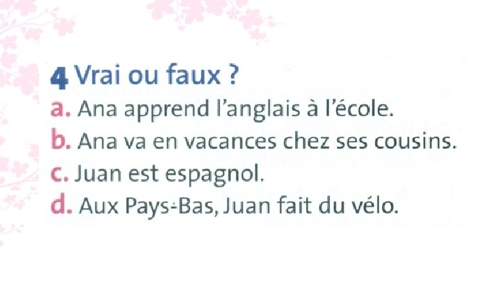 4. a. faux (elle apprend le français) ; b. vrai ; c. vrai; d. vrai.