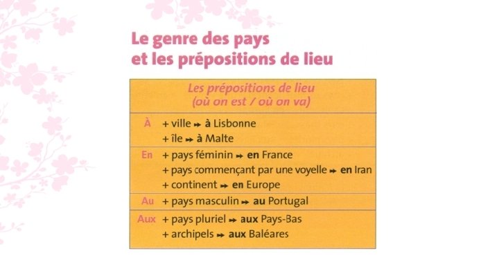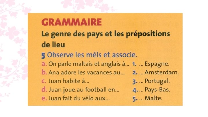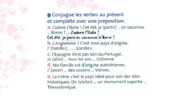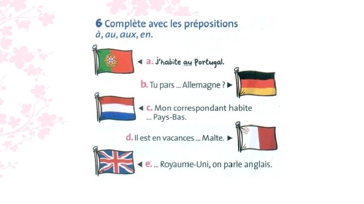 7. a. Alex habite en France. b. Tu pars aux Pays-Bas ? c. En Belgique, on parle français. d. Maïa va en vacances au Maroc.