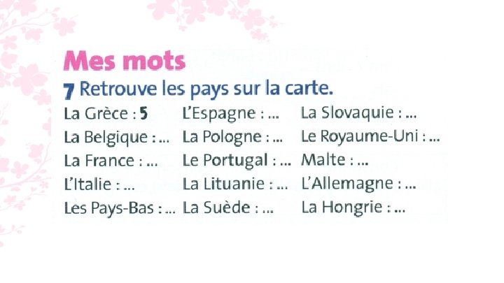 3 b. 2. La Belgique; 3. L’Espagne; 4. La France; 5. La Grèce; 6. La Hongrie; 7. L’Italie; 8. La Lituanie; 9. Malte; 10. Les Pays-Bas; 11. La Pologne; 13. Le Royaume. Uni; 14. La Slovaquie; 15. La Suède.