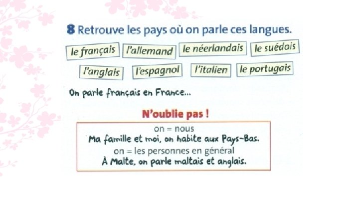 8. - On parle français en France, en Belgique, et au Luxembourg. - On parle allemande en Allemagne, en Autriche et au Luxembourg. - On parle néerlandais aux Pays-Bas et en Belgique. - On parle suédois en Suède.