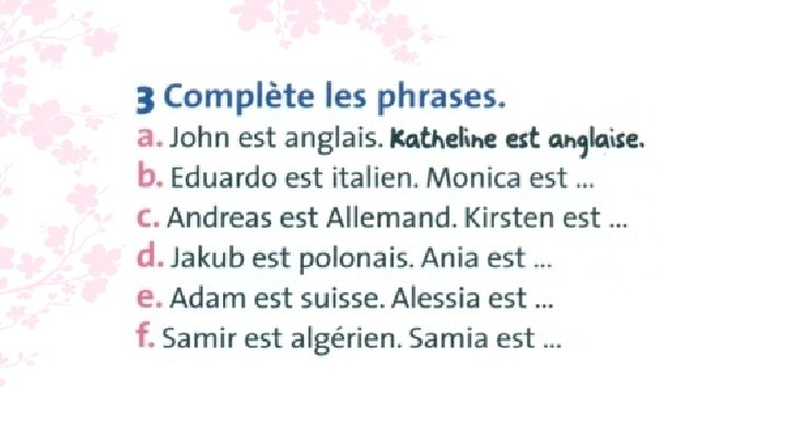 3. a. John est anglais. Katherine est anglaise. b. Edurado est italien. Monica est italienne. c. Andreas est allemand. Kristel est allemende. d. Jakub est polonais. Ania est polonaise.