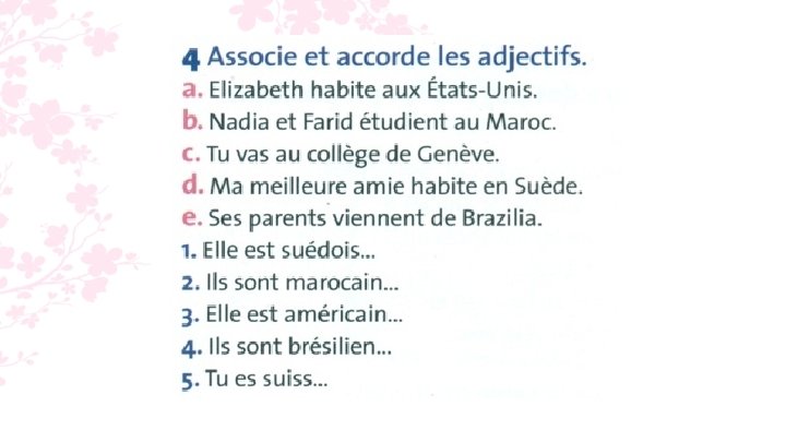 4. - [a-3] Elizabeth habite aux Etats-Unis. Elle est américaine. - [b-2] Nadia et Farid étudient au Maroc. Ils sont marocains. - [c-5] Tu vas au collège de Genève. Tu es suisse.