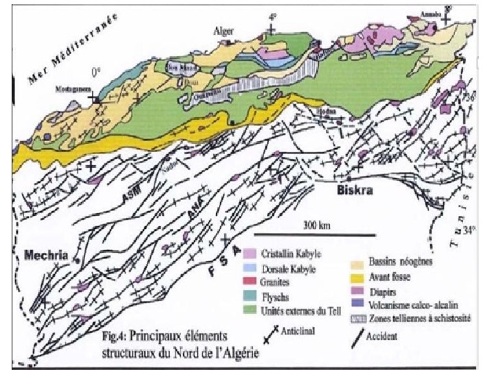 La tectonique alpine Avec la fin de l’Aquitanien, commence une phase tectonique compressive (début de la compression alpine) se manifeste par la collision des deux plaques Afrique Europe, La figue ci dessous (fig. 1) les principaux éléments structuraux du nord de L’Algérie qui sont au sud vers le nord : système atlasique, l’avant fosse sud tellienne, le domaine tellien externe, le domaine des flyschs et en fin le domaine Kabyle interne (socle Kabyle, dorsale Kabyle).