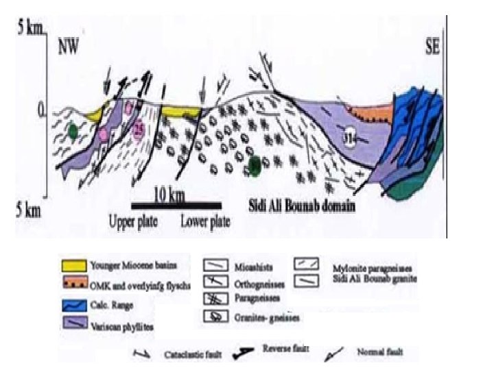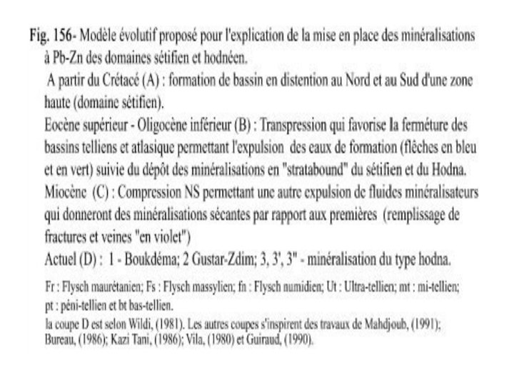 Conclusion • On admet aujourd’hui que le domaine interne de la chaîne des Maghrébides faisait autrefois partie d’un micro continent ou terrane appelé Al. Ka. Pe. Ca (pour Alboran, Kabylies, Paloritain et Calabre qui sont les différents massifs internes de l’orogènepéri méditerranéen) qui était situé beaucoup plus au Nord et appartenait à la marge européenne. La dorsale kabyle constituait la marge méridionale et le talus continental de ce bloc. Les flyschs se sont déposés dans le bassin océanique profond qui séparait la marge européenne (ou le bloc Al. Ka. Pe. Ca) et la marge africaine. Les flyschsmaurétaniens se sont déposés au pied de la dorsale kabyle et sont alimentés par les zones internes. Les flyschsmassyliens se sont déposés au pied de la marge africaine et sont alimentés par les zones externes. Certains flyschs, tels ceux de Ziane ou de Tamalous présentent des caractères mixtes où s’intriquent verticalement tous les faciès caractéristiques de l’une ou l’autre des deux séries de flyschs, ce qui indique qu’ils se sont probablement déposés dans une zone de milieu de bassin, recevant aussi bien du matériel d’origine méridionale que d’origine septentrionale. Les nappes telliennes correspondent à la couverture sédimentaire qui s’est déposée sur la marge nord de la plaque africaine (figure 9).