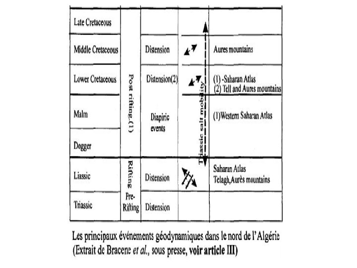 • Dans l’Atlas plissé, les structures décrites sont qualifiées de longues et étroites pour les anticlinaux et larges et à fond plans pour les synclinaux. • Le Pré atlas considéré comme tabulaire montre des plis aussi bien dans ses zones occidentales (par exemple la région de Mechria), au centre (région d’Al Bayadh)ou encore vers l’est (au nord de Bou Saada). Les structures anticlinales présentent parfois des flancs sub verticaux, voire déversés vers le sud. Les axes de plis sont orientés SW NE, de même que les pluparts des accidents. Les anticlinaux sont parfois percés par des diapirs. La mobilité de ce matériel triasique débutant dès le Lias et qui se poursuit jusqu’au Quaternaire. L’initiation du mouvement est contemporaine de la phase distensive du Lias et présente une relation avec les événements géodynamiques reconnus dans cette partie de la marge sud téthysienne. • Deux modèles sont proposés pour la formation de la chaine. Le premier attribue un rôle important aux décrochements (durant la phase de rifting). Ce sont les accidents de socle qui régiraient la structure de ce domaine comme le présentent les coupes Fig. 4 (a ; Guiraud), (b ; Vially), (c ; Djebar).