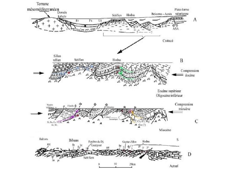 La figure 7 montre un exemple d’agencement des différents domaines et unités cités précédemment en Algérie (exemple du Constantinois, Algérie nord-orientale). Figure 7 : Coupe générale synthétiqu e des Maghrébides de l’Est algérien (région du Constantinois) Fr : Flysch maurétanien ; Fs : Flysch massylien ; Ut : nappes telliennes du type Ultra tellien ; ASA : Accident sud atlasique Fig. 8 – Coupe palinspatique schématique NS (au Crétacé) passant par les domaines sétifien. Hodna-Aurès (le schéma est basé sur les données de : Guiraud, 1973 ; Vila, 1980 ; Bureau, 1986 ; Kazi. Tani, 1986 ; Bouillin, 1990 ; et Guerrera et al, 1993 )
