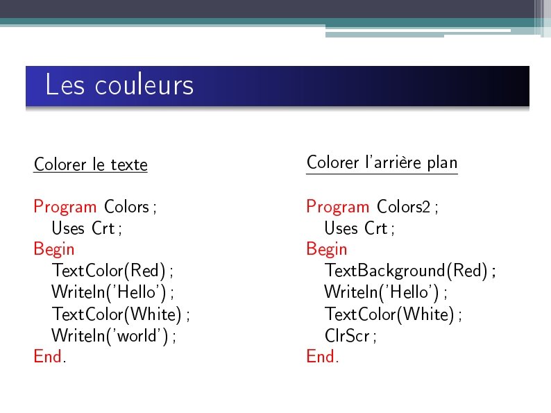 Algorithme moyenne; Variables N 1, N 2, Moy: réels; Début Lire(N 1, N 2); Moy ← (N 1 + N 2)/2; Si ( Moy >= 10 ) Alors Ecrire(‘Admis’); Sinon Ecrire(‘Ajourné’); Fin. Si; Fin. Programme Pascal Program moyenne; Var N 1, N 2, Moy: Real; begin readln(N 1, N 2); Moy : = (N 1 + N 2)/2; If ( Moy >= 10 ) then writeln(‘Admis’) Pas de point virgule Else writeln(‘Ajourné’); readln; end.