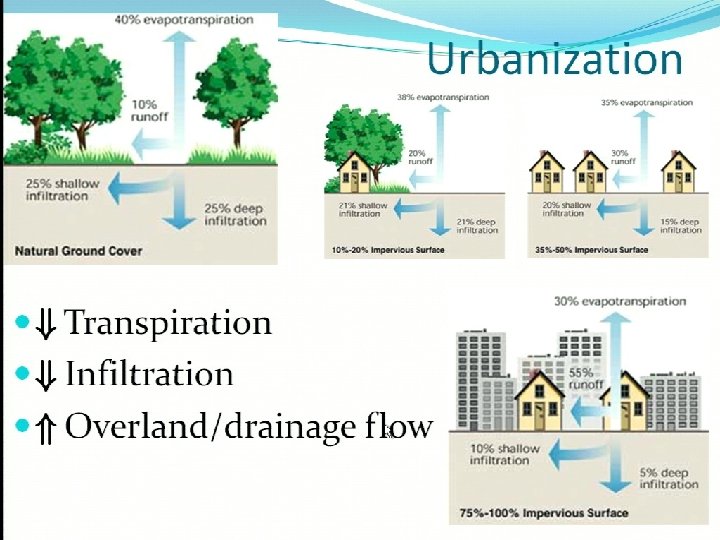 Effects of urbanisation on drainage • Consequences of urbanisation • Less evapotranspiration • Less infiltration • A lot more runoff