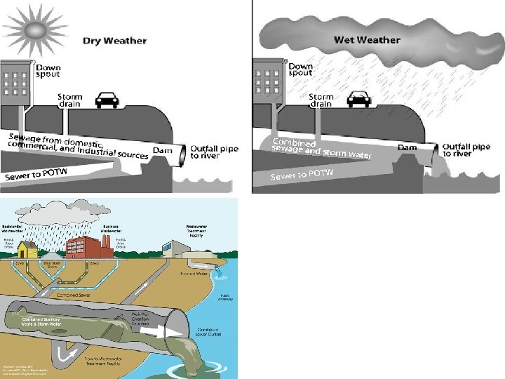 Combined systems • In dry weather, the system carries wastewater flow. During rainfall, the flow increases as a result of the inflow of stormwater. • The stormwater flow exceeds the wastewater flow even under light rainfall conditions. During heavy rainfall, storm water flow exceeds wastewater flow by a factor of 100 to 1000 or more. • It is not economically feasible to provide capacity for the Total flow under these conditions. Therefore, in combined systems so-called combined sewer overflows are installed to discharge excess water that cannot be transported towards the wastewater treatment plant, to surface water.