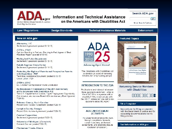 Overview of ADA § Civil Rights Law § Issues of: - Handled by: § Employment - US Equal Employment Opportunity Commission § Education - US Department of Education § Transportation - US Department of Transportation § Public Land - US Department of Interior § Access - US Department of Justice § Each of these federal organizations provide technical assistance, advocacy and handle complaints § Additionally there is an official network of regional technical assistance organizations called the ADA National Network 20