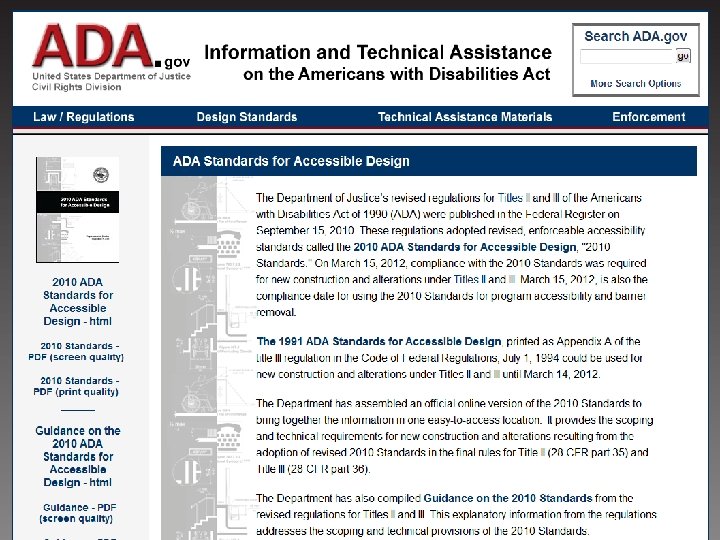 First Revisions to ADA Regulations in 20 years - what are they? Ø Published in Federal Register September 15, 2010 - one book edition - see www. ADA. gov Ø Two regulations Ø Title II: State and local governments; - 28 CFR 35. 151 Ø Title III: Public accommodations and commercial facilities; - 28 CFR part 36, subpart D Ø Regulations, appendices, guidance, assistance and standards are all available at U. S. Department of Justice’s ADA website (www. ada. gov) …Ready for use… 18