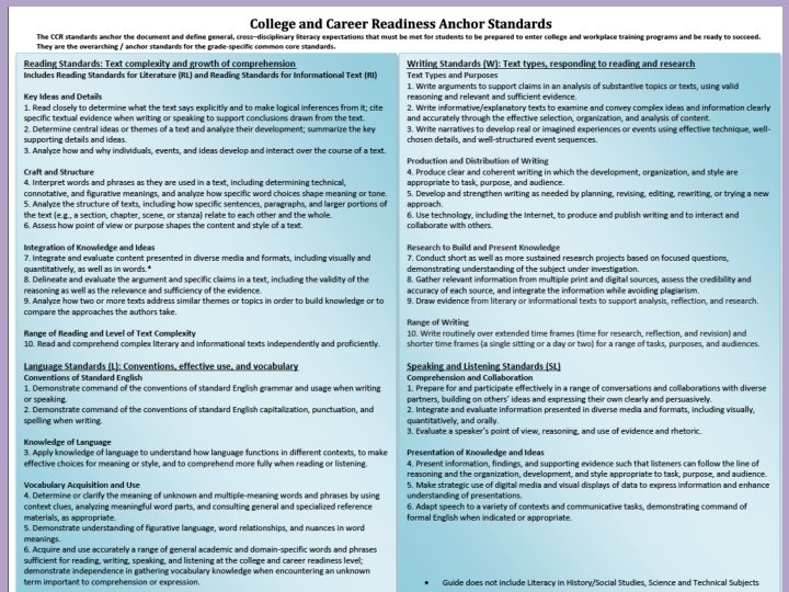 College and Career Readiness Standards for Adult Education: ELA Strands: Reading (Information and Literature), Reading Foundational Skills, Writing, Speaking/Listening, and Language. Also includes Literacy in the Technical Subjects within the other strands. CCR Standards page 12.