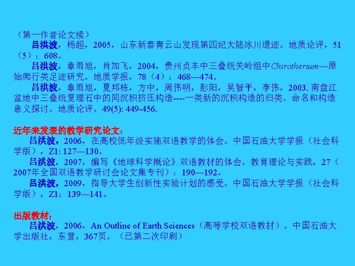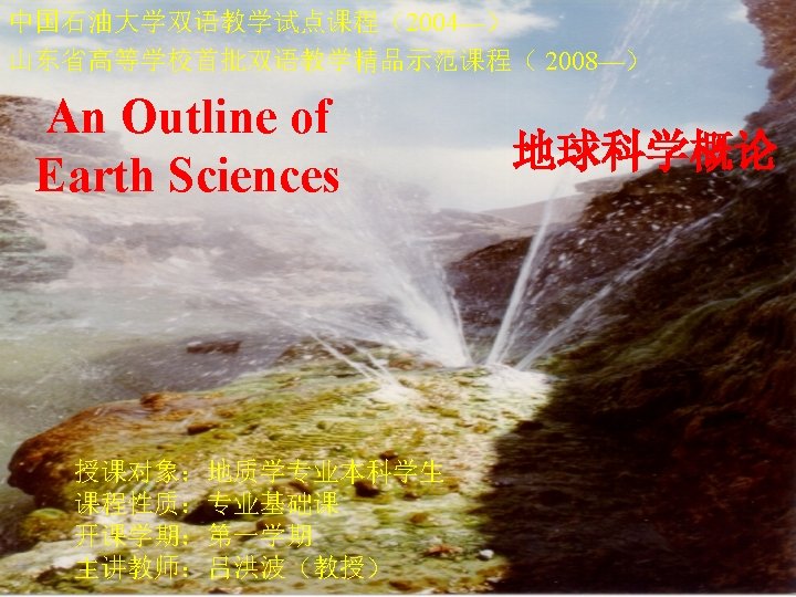 Course name: An Outline of Earth Sciences 地球科学概论 (Introduction to Earth Sciences) Textbook (教材):吕洪波,2006,《An Outline of Earth Sciences》( 地球科学概论),中国石油大学出版社, 367 pp. References or bibliography 参考书目: 1. 夏邦栋主编:《普通地质学》,1995年,地质出版社 2. www. http: //google. com,输入地学关键词汇查询 3. 其他网络资源(见教材每章末尾网址链接) Teacher (教师):吕洪波教授 (Professor Hongbo Lu) Requirement in class 课堂要求:记录课堂笔记 Make notes Requirement after school课余要求: 预习和复习 preview and review Time table and places 时间与地点:见课程表(curriculum schedule) Tests and scores 考核与成绩: 平时参加、实验室成绩(矿物岩石标本鉴定) (30%) 笔试成绩(英文试卷,重点词汇附汉语标注,开卷考试)(70%)