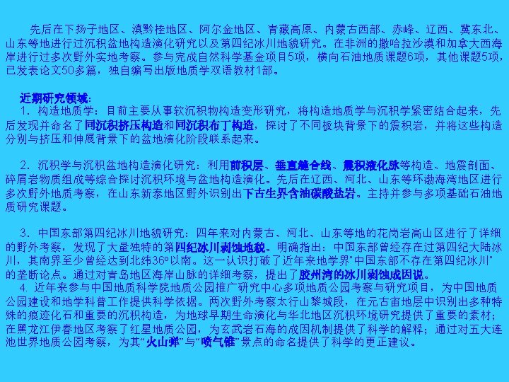 1. 2 The hardship and the pleasures of geologists (地质学家的苦与乐) My students, the prospective geologists, often ask me what hardship I have endured and what pleasure I have experienced. Different geologists have different answers, but as for me, I would rather say: the hardship is that I have to leave home to work in the field and the pleasure is that I can work in the field. Is this self-contradictory? No. A real geologist is always related to fieldwork. No fieldwork, no geologist. Only working in the field can a geologist really understand the secrets of nature! As geologists, we have to bear the extreme hardship and, at the same time, we can enjoy the special pleasure from mother nature. Here I would love to show you two examples related to geologists. There is a very sad poem published in 1984 in the newspaper to describe the geologists’ life of that time. If you have a daughter, Don’t marry her to a geologist; She will be lonely at home all the year round. When the husband comes back occasionally from the field, All belongings to her are the tattered clothes and dirty socks in the bed. (translated by Hongbo Lu)