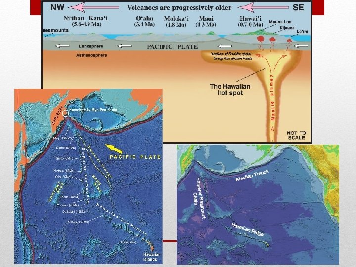 ISLAND ARCS • The Island of Hawaii is the youngest island in the chain. The most southeastern part of the Island presently sits on top of the hot spot. The active submarine volcano Lö'ihi, will form the next volcanic island. With the possible exception of Maui, the other Hawaiian islands have moved northwest beyond the hot spot and have become cut off from the sustaining magma source and are no longer volcanically active. • The progressive northwesterly drift of the islands from their point of origin over the hot spot is well shown by the ages of the principal lava flows on the various Hawaiian Islands from northwest (oldest) to southeast (youngest), given in millions of years: Ni'ihau and Kaua'i, 5. 6 to 3. 8; O'ahu, 3. 4 to 2. 2; Moloka'i, 1. 8 to 1. 3; Maui, 1. 3 to 0. 8; and Hawai'i, less than 0. 7 and still growing. SOURCE