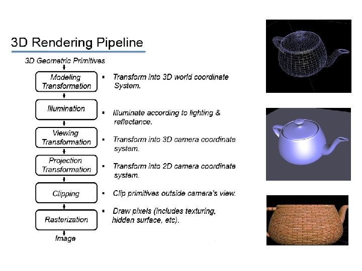 Graphics Basics • • Rendering Pipeline Object Representation, Modeling, Transformation Visual Appearance (Lighting, Shading, Material) Texture mapping, bump mapping, … Visibility (Z-buffers, … ), Terrain Visualization Basic Image Processing Photo-Realistic Rendering (Raytracing, …)
