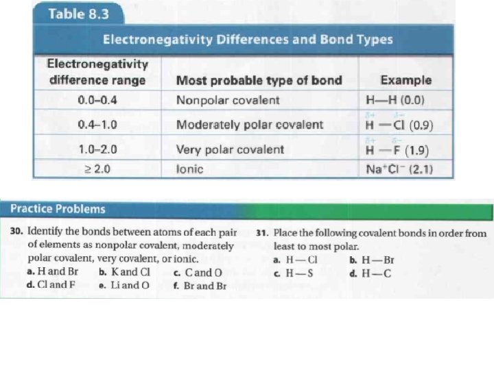 • Let’s look at a hydrogen chloride (HCl) molecule. – It is composed of hydrogen (electronegativity = 2. 1) and chlorine (electronegativity = 3. 0) • Make a prediction… Which partial charge will each atom have? • Chlorine has a higher electronegativity, so it will be partially negative. • If the electronegativity difference reaches 2. 0, it is very likely an electron will be transferred, rather than shared. – An ionic bond will form, rather than a covalent bond.