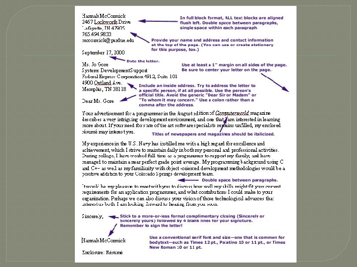 The final paragraph � � Indicate your interest in being contacted for an interview. Indicate when and how you can be contacted. Express enthusiasm for the position. Example: It would be my pleasure to meet with you to discuss how well my skills might fit your current requirements for an application programmer, and what contributions I could make to your organization. Perhaps we can also discuss your vision of those technological advances that interest us both. I am looking forward to hearing from you soon. � � End with a closing line (sincerely, etc. ) Follow with 4 blank lines (for signature) Type first and last name Any enclosures • Enclosure: Resume