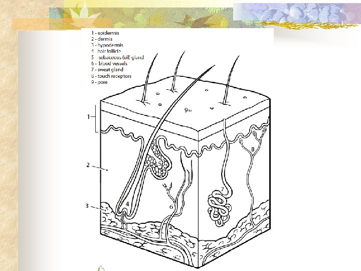 The Skin: A Cutaneous Membrane n Protects the body n n Body covering Maintains homeostasis n n n Regulates body temperature Slows water loss Houses sensory receptors Excretes wastes Absorbs UV radiation