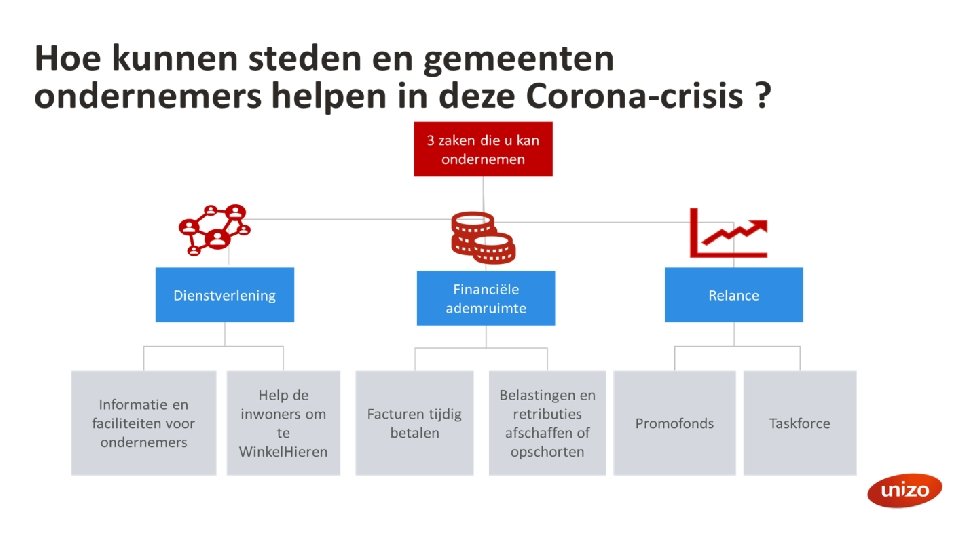 COVID 19 en lokale relance – 3 fases Lockdown (maart-mei 2020) Communicatie Herstart diverse sectoren (mei) Praktische ondersteuning Opschorten of schrappen belastingen: (11/05 handel, 18/05 markten, 08/06 Doorstart horeca, ? events) inname openbaar domein/terrassen/markten, concessies, ongeadresseerd drukwerk Premies, bonnenacties Versterking lokale markt: promotie lokaal aankopen, betalingsbeleid tav leveranciers, gemeentelijk aankoopbeleid Vooronderzoek Herinrichting openbaar domein (in tijd Gerichte investeringen en ruimte) Versterking en innovatie lokaal sociaal -economisch netwerk met digitalisering als opportuniteit - Community 2 B - GOV 2 B - B 2 C