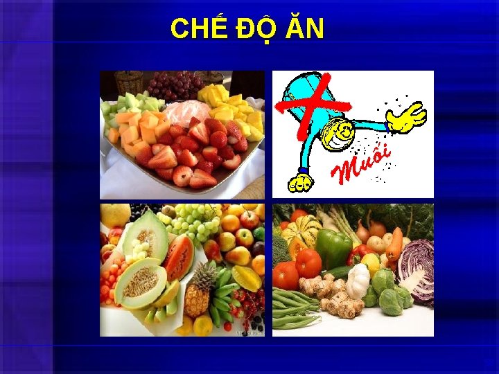 CHỂ ĐỘ ĂN DASH Diet Approach to Stop Hypertension 1 - Giảm muối Na <6 g/ngày 2 - Tăng muối Kali >4 g/ngày 3 - Tăng phosphate 1, 7 g/ngày 4 - Nhiều rau, củ, trái cây, tăng chất xơ 5 - Giảm Calci 6 - Giảm thịt đỏ, tăng Cá, Tăng protein thực vật 7 - Giảm béo, không transfat KHÔNG DÙNG cho CKD 4 -5 ( GFR < 30 ml/ph/1, 7 Sack FM et al, N Engl. J Med, 2001, 344 (1), 3 -10