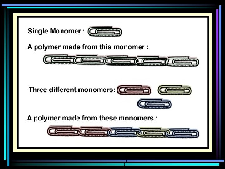 How do monomers become polymers? ? ? • dehydration synthesis: synthesis (to build from small large) – also called condensation rxn – when monomers are put together, each bond that is built releases a water molecule • hydrolysis rxn: -lysis (to break down from large small) – water added – this is how monomers are broken apart