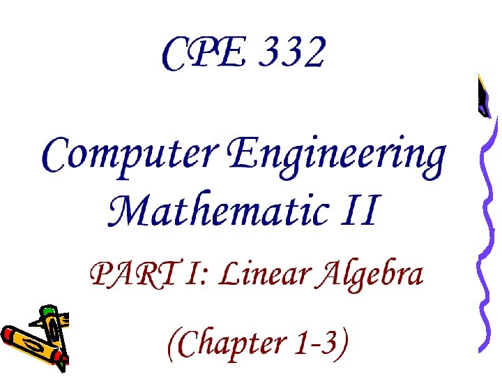 Today Topics • Period 1 – – – Course Outlines Course Web Site Part I Chapter 1 Vector (Review) Breaks Part I Chapter 1 Vector (Review) • Assignment: – ยงไมมการบาน – Download MATLAB Tutorial 1 -5 และลองทำ Exercise ด • Next Week ตอ Vector และ Chapter 2 เรอง Matrix