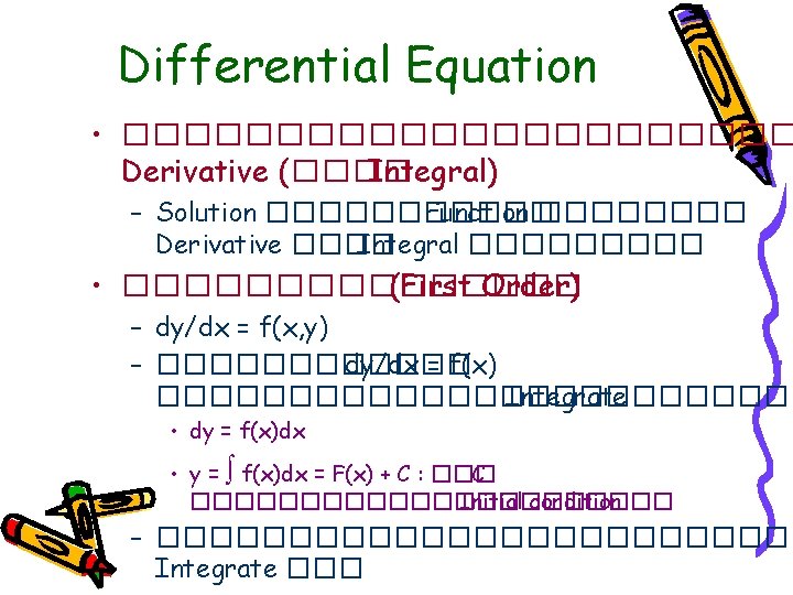 CPE 332 Computer Engineering Mathematics II Part III Slides: 54 Download presentation CPE 332 Computer Engineering Mathematics II Part III, Chapter 11 ODE Today Topics • Chapter 11 Ordinary Differential Equation • HW 10 Due Example 1 • Solve for Example 1 • Solve for Example 1 • Solve for Differential Equation • ��� Order ����� Derivative ������� Order ��� Differential Equation – ����� Initial Condition ����������� Order ���� Example 2 Example 2 • ���� Integrate ไมได Differential Equation • Tools ���������� Differential Equation – Laplace Transform (one side/two side) – Fourier Transform ������� – Z-Transform �������� Discrete Version ��� Differential Equation • ��� Differential Equation ������������ • �������� Difference Equation – ����������� CPE Differential Equation • ������� Numerical Method ���������� Differential Equation – ��������� First Order ��� Initial Condition ������� – ������ Ordinary Differential Equation • One Independent Variable – ���������� Higher Order ��� – ������ Boundary Condition ��������� • ���������� Reference Chapter 10 • Ordinary Differential Equation ODE ODE ODE ODE: One Step Method ODE: One Step Method Euler’s Method Euler’s Method Euler’s Method Euler’s Method Euler’s Method Euler’s Method Heun and Polygon Method Heun Method Heun Method Heun Method Heun and Polygon Method Heun Method Heun and Polygon Method Heun Method Heun Method Improved Polygon Method Improved Polygon Method Runge-Kutta Method Runge-Kutta Method Second Order Runge-Kutta Method Second Order Runge-Kutta Method Second Order Runge-Kutta Method Second Order Runge-Kutta Method Second Order Runge-Kutta Method Second Order Runge-Kutta Method Second Order Runge-Kutta Method Second Order Runge-Kutta Method Second Order Runge-Kutta Method Third Order Runge-Kutta Method Third Order Runge-Kutta Method Forth Order Runge-Kutta Method Forth Order Runge-Kutta Method Higher Order Runge-Kutta Method Comparison Chapter 11 Homework (HW 11) • Download ������� Sheet End of Chapter 11 • Next Week – Ch. 12 Curve Fitting (������� Text) – HW 12 – Last Chapter • Course ENDs