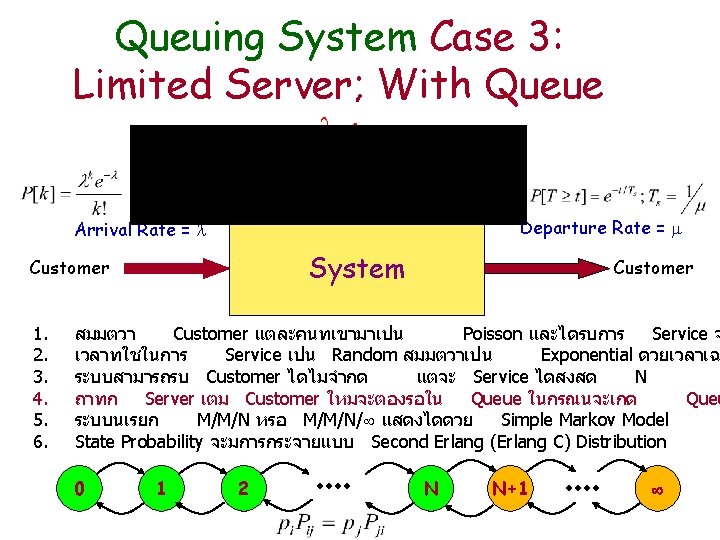Queuing System Case 2: Limited Server; No Queue < Departure Rate = Arrival Rate = System Customer 1. 2. 3. 4. 5. Customer สมมตวา Customer แตละคนทเขามาเปน Poisson และไดรบการ Service จ เวลาทใชในการ Service เปน Random สมมตวาเปน Exponential ดวยเวลาเฉ ระบบสามารถรบ Customer ได N ถาทก Server เตม จะรบ Customer ใหมไมได ระบบนเรยก M/M/N/N แสดงไดดวย Simple Markov Model State Probability จะมการกระจายแบบ First Erlang (Erlang B) Distribution 0 1 2 i j N