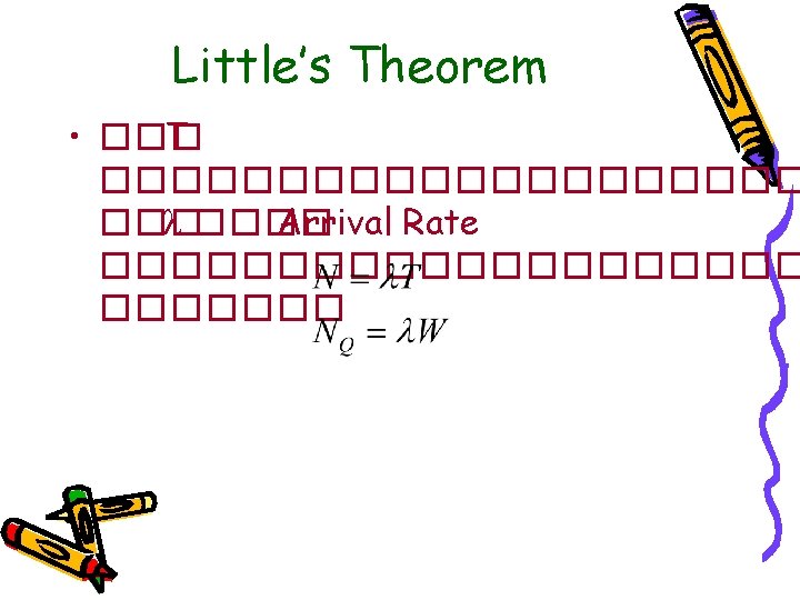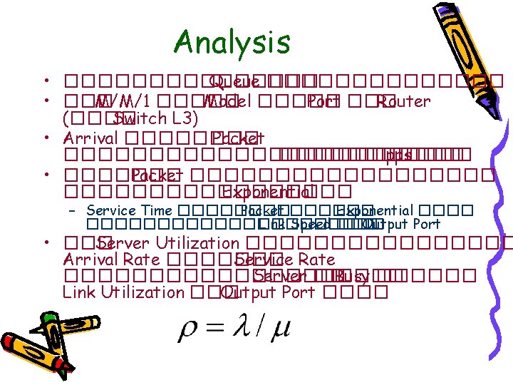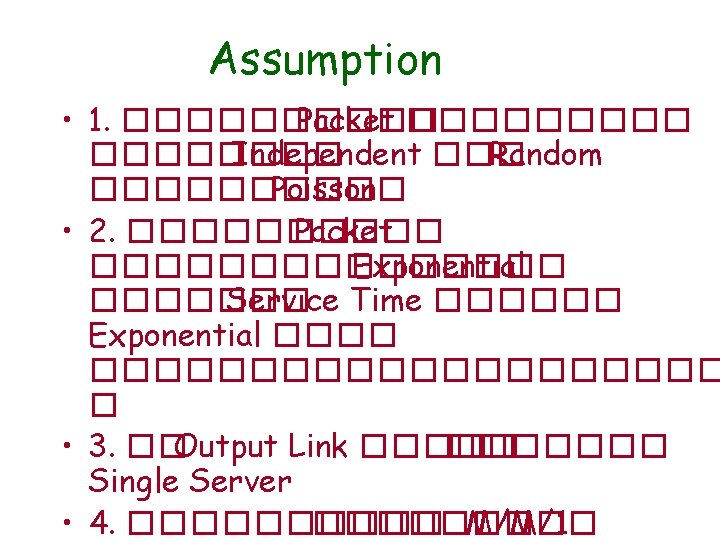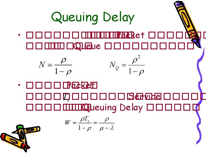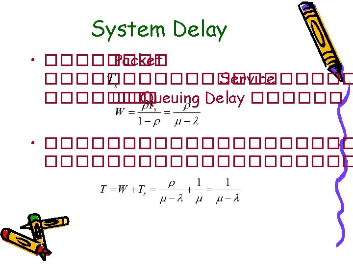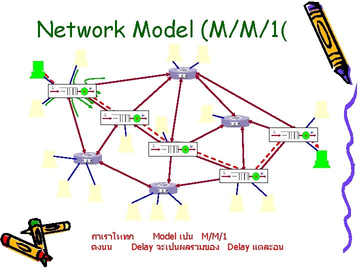 Example • Router ������ Packet ������ 8 pps – ����� Packet ������� Exponential ��������� 500 Octet – Link ������� 64 kbps • 1. Arrival Rate, = 8 pps • 2. �������� Packet = 4000 bit • 3. ���� Link = 64 k ������� Service Time, Ts ���� Packet = 4000/64 k = 1/16 • 4. Service Rate( ) = 16 pps • 5. Server Utilization = 8/16 =0. 5 = 50%