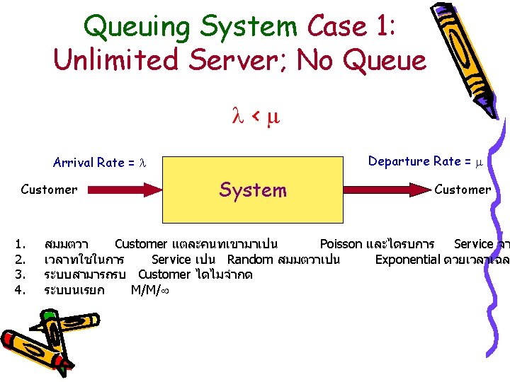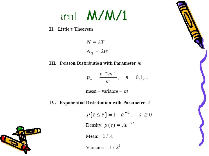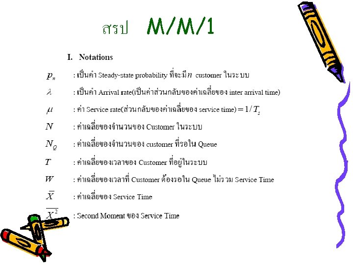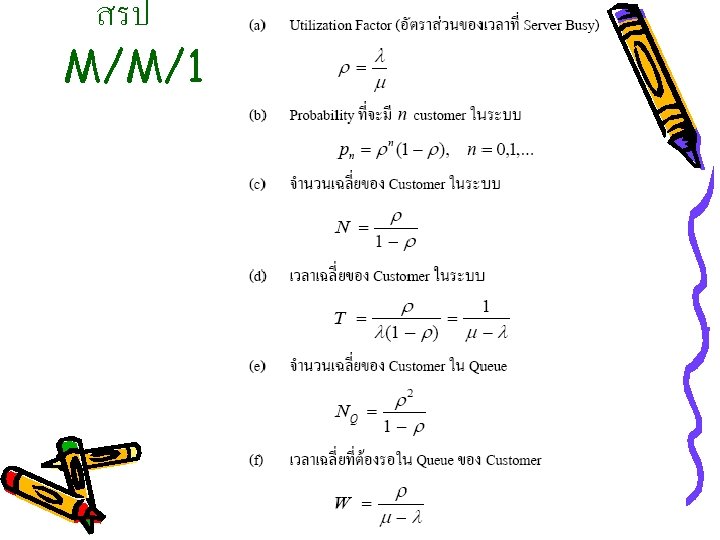Queuing Model(1 Server); M/M/1 Queue = 0, No Delay Queue = Delay 0 Server วาง arrival rate 1 N+2 X Server Busy 1/Ts = service rate For each server