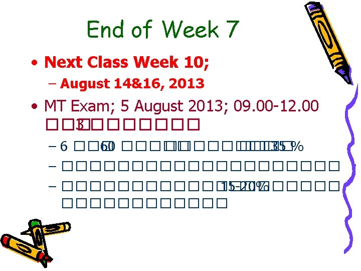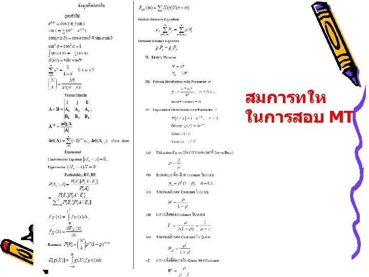 MT Topics: 6 ขอ 6 บท • 1. Vector, Direction Cosine, Dot/Cross Product and Application in Geometry • 2. Matrix Determinant, Inverse • 3. Eigenvalue, Eigenvector, Diagonalization • 4. Conditional Probability, PDF and Expectation • 5. Auto/Cross Correlation, Markov Chain, Global/Detailed Balance Equation • 6. M/M/1 Queuing System