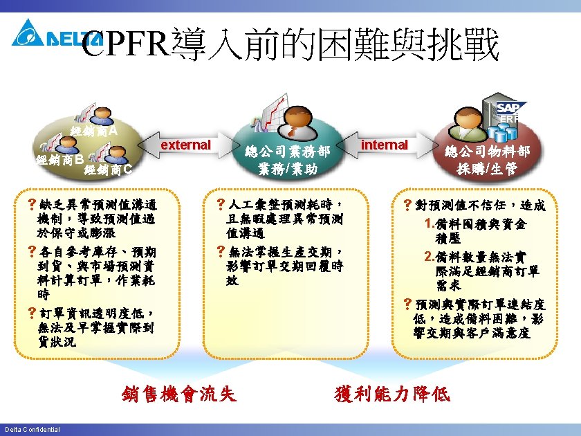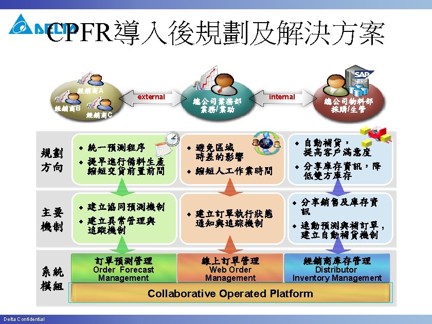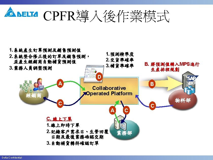 CPFR Customer Related Function Partner (帳單/付款 /送貨) Sales View Delta Confidential 設定業務/ 業助與客 戶之關聯 客戶 資料 設定預測 產品 維護運輸 時間