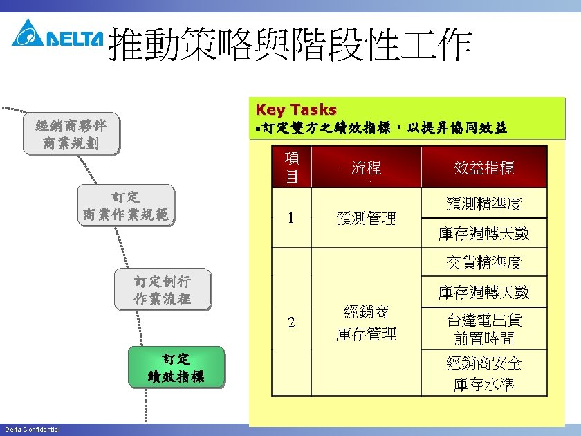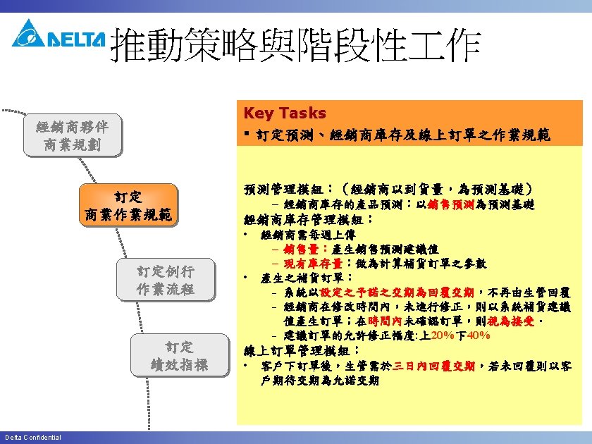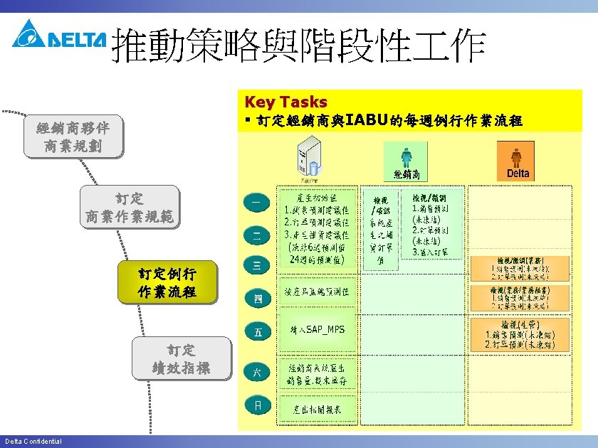 New Customer for 預測客戶 Item 16 17 Delta Confidential Task UFS Project Mgmt UFS 排程設定 Setup Schedule Job by which T-code / program / Function / CPFR menu Terminal Server(IABUCPFRUFS) Owner IT UFS Project Mgmt IT /n. YSCPFR 2 System Mgmt IT 18 Download Open SO/DN to CPFR 19 Start to maintain Forecast future sales Forecast Planning data 20 Confirm Suggest order Inventory Mgmt 經銷商/分公 司