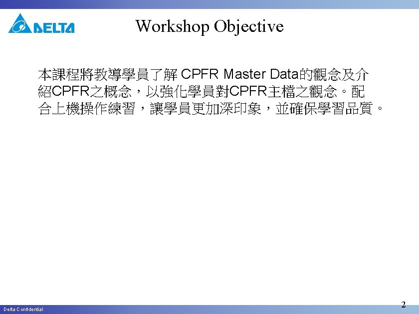 CPFR Learning Program CPFR 主檔維護 Instructor : Sandy. Fan(112 -5436) OCT 14 2010 Delta Confidential