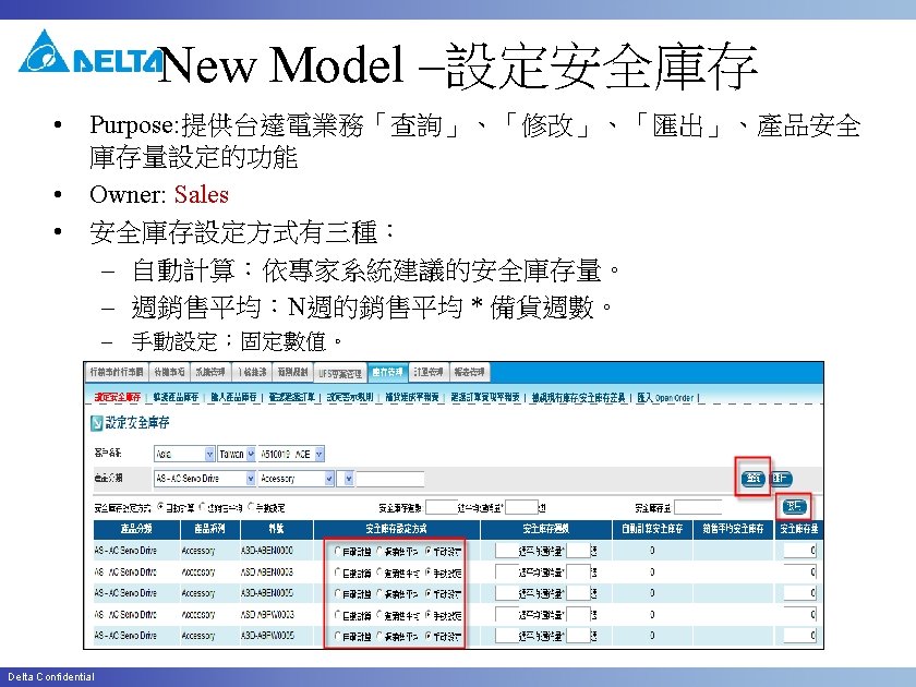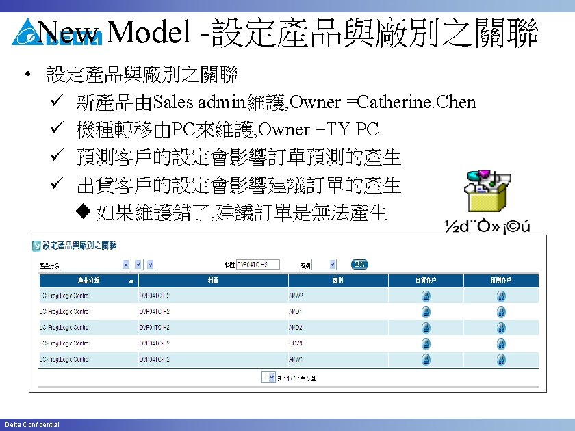 New Model -設定產品與廠別之關聯 • 出貨客戶 FOR AMW 2/4 (內銷) AMW 1/3(外銷) • 預測客戶 FOR AMD 1/AMD 2 (for TW ) Delta Confidential