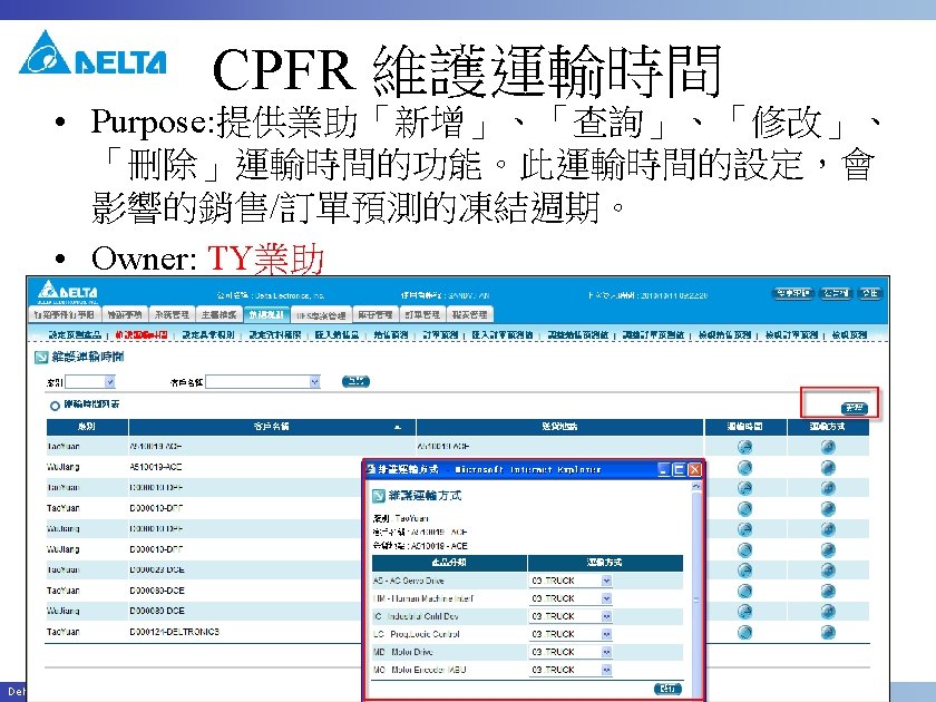 CPFR Customer資料 • Purpose: 提供業助「查詢」、「修改」客 戶資料的功能 Delta Confidential